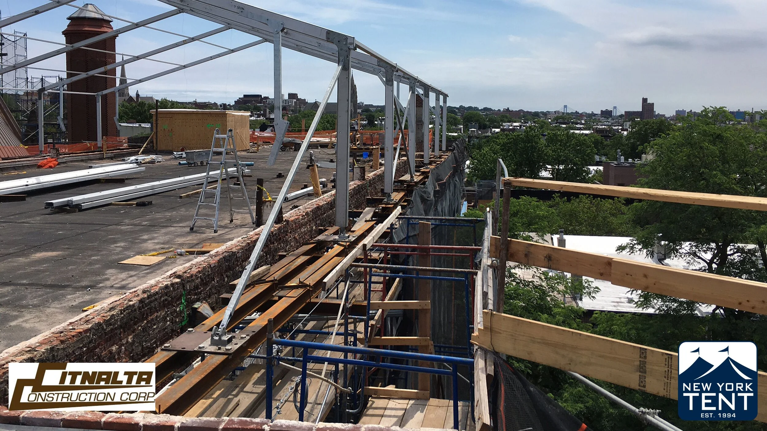The tent did not sit on top of the roof at any point. Bolted and welded to the side of the building, NY Tent in conjunction with safety managers from the local union installed solved the problem.